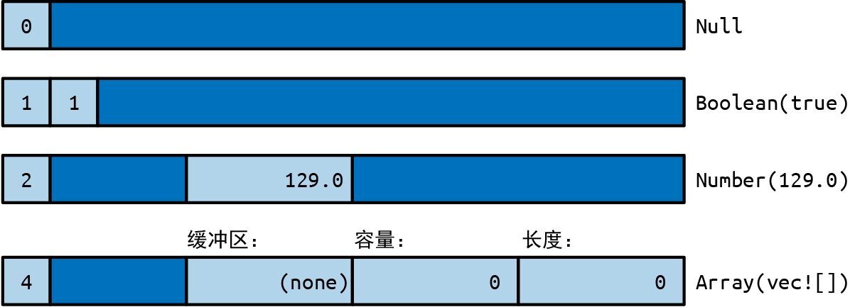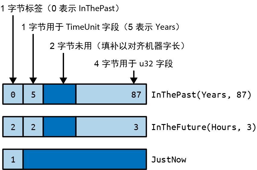 }至此,C 风格枚举就介绍完了。更有趣的 Rust 枚举类型是其变体中能持有数据的类型。我们将展示如何将它们存储在内存中、如何通过添加类型参数来泛化它们,以及如何运用枚举构建复杂的数据结构。