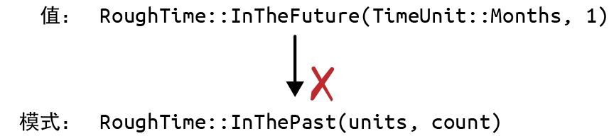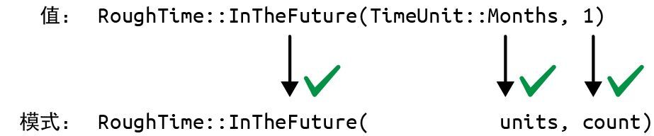 最后, x @ pattern 会与给定的 pattern 精确匹配,但成功时,它不会为匹配到的值的各个部分创建变量,而是会创建单个变量 x 并将整个值移动或复制到其中。假设你有如下代码: