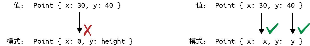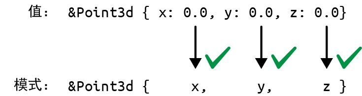 请注意,上述 4 个示例中都使用了确保匹配的模式。模式 Point3d { x, y, z } 会匹配 Point3d 结构体类型的每个可能值, (x, y) 会匹配任何一个 (f64, f64) 值对,等等。这种始终都可以匹配的模式在 Rust 中是很特殊的,它们叫作 不可反驳模式,是唯一能同时用于此处展示的 4 个位置( let 之后、函数参数中、 for 之后,以及闭包参数中)的模式。