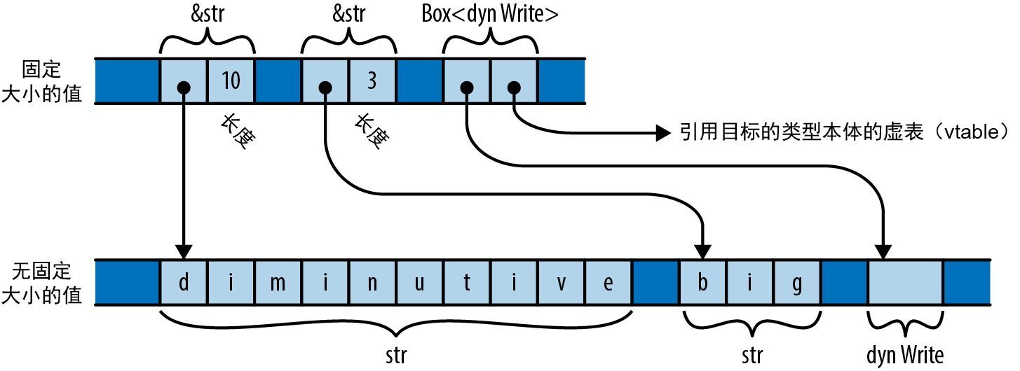 特型对象和指向切片的指针在结构上很像。这两种类型都缺乏某种在使用它们时必要的信息。换句话说,你无法在不知道其长度的情况下对 [u8] 进行索引,也无法在不知道该对某个值使用 Write 的哪个具体实现的情况下调用 Box<dyn Write> 的方法。对于这两种类型,胖指针都会补齐类型中缺少的信息——它携带着长度或虚表指针。既然欠缺静态信息,那就用动态信息来弥补。