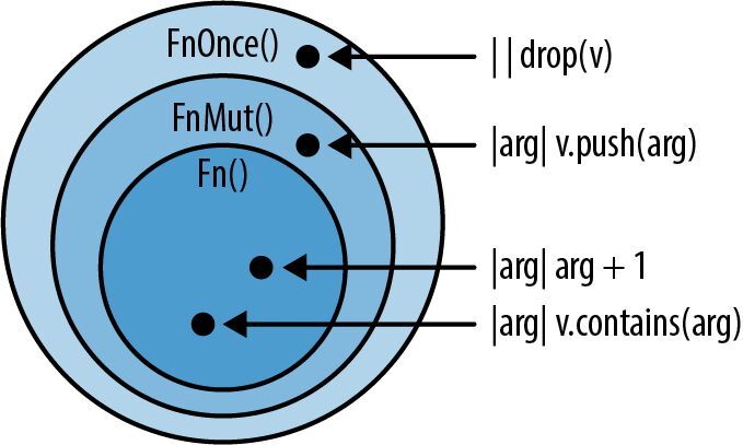 }如图 14-1 所示,闭包具有独特的类型,因为每个闭包会捕获不同的变量,所以和别的语法元素一样,它们各自具有不同的大小。但是,如果闭包没有捕捉到任何东西,那就没有什么要存储的了。通过在接受回调的函数中使用 fn 指针,可以限制调用者仅使用这些非捕获型闭包,以牺牲调用者的灵活性为代价,在接受回调的代码中换取一定的性能和灵活性。