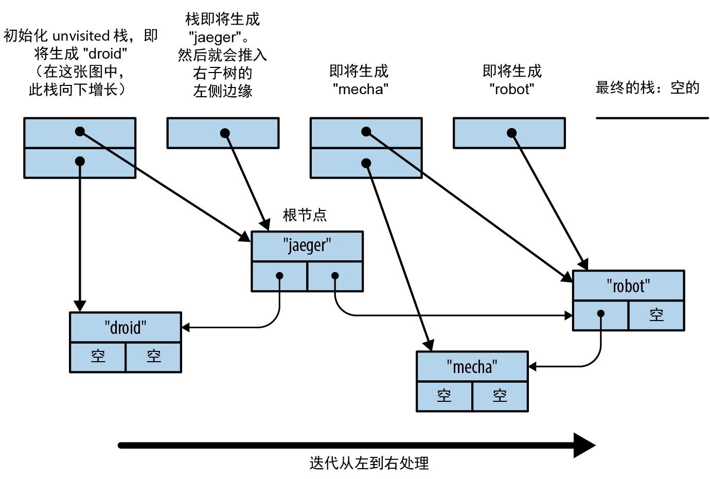 assert_eq!(v, ["droid", "jaeger", "mecha", "robot"]);图 15-1 展示了当我们遍历示例树时 unvisited 栈的行为方式。对于每一步,下一个要访问的节点都会位于栈顶,所有未访问的祖先则位于其下方。
