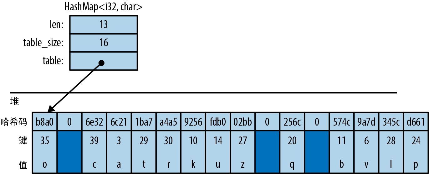 创建一个新的空 HashMap,其中至少有 n 个条目的空间。与向量一样, HashMap 会将数据存储在分配在堆上的单块内存中,因此它们有容量及其相关方法 hash_map.capacity()、 hash_map.reserve(additional) 和 hash_map.shrink_to_fit()。 BTreeMap 则没有这些。