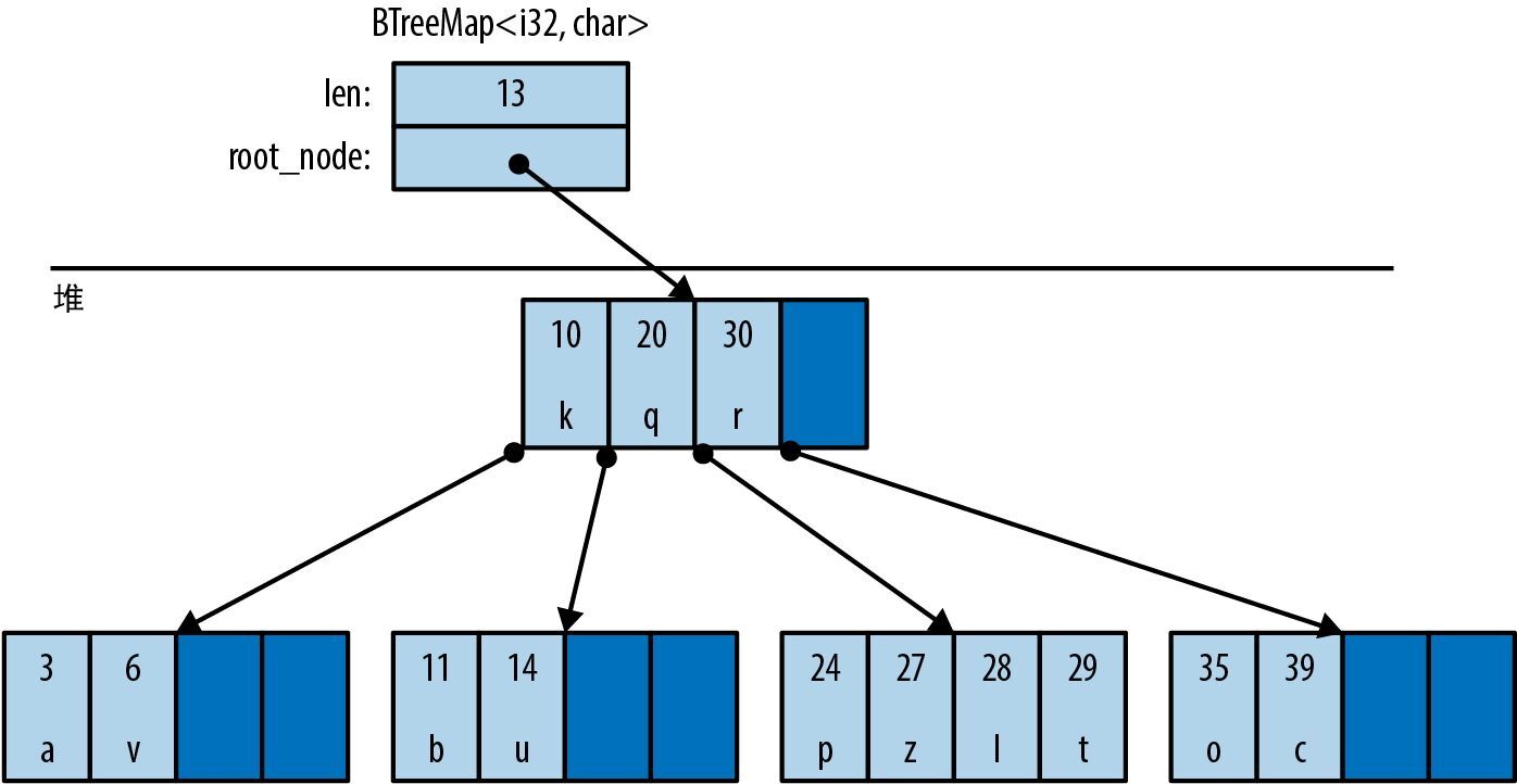 为了适合页面大小,图 16-5 已略作简化。例如,真正的 BTreeMap 节点会有 11 个条目的空间,而不是 4 个。