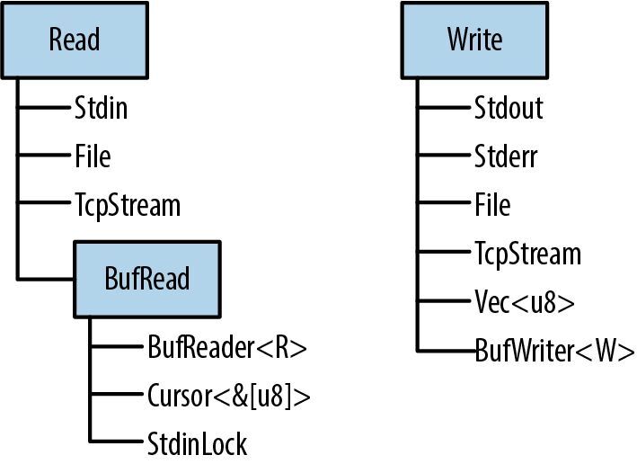 Rust 标准库中的输入和输出的特性是围绕 3 个特型组织的,即 Read、 BufRead 和 Write。