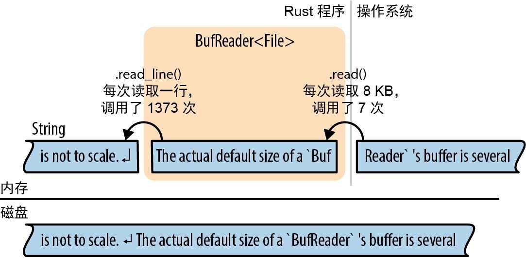 图 18-2 未按比例绘制。 BufReader 缓冲区的实际大小默认为几千字节,因此一次 read 系统调用就可以服务数百次 .read_line() 调用。这很重要,因为系统调用很慢。