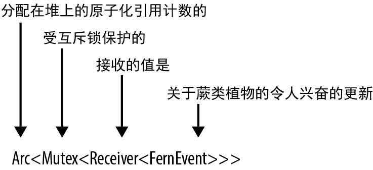 }我们正在使用 Arc<Mutex<Receiver<T>>>。这些泛型简直像俄罗斯套娃。这种情况在 Rust 中比在 C++ 中更常见。虽然这看起来会让人感到困惑,但通常情况下(就像在本例中一样),仅仅读出名称就可以帮你理解发生了什么,如图 19-11 所示。