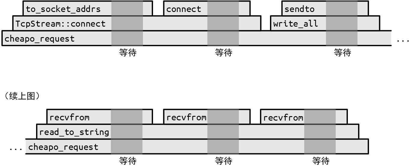 图 20-1 展示了当时间从左到右流逝时,函数的调用栈的情况。每个函数调用都是一个方框,叠放在其调用者上方。显然, cheapo_request 函数贯穿了整个执行过程。它会调用 Rust 标准库中的函数(如 TcpStream::connect)以及由 TcpStream 实现的 write_all 和 read_to_string 这两个特型方法。它们又会依次调用其他函数,但此程序最终会进行一些 系统调用,请求操作系统实际完成某些操作,比如打开 TCP 连接,读取或写入一些数据。