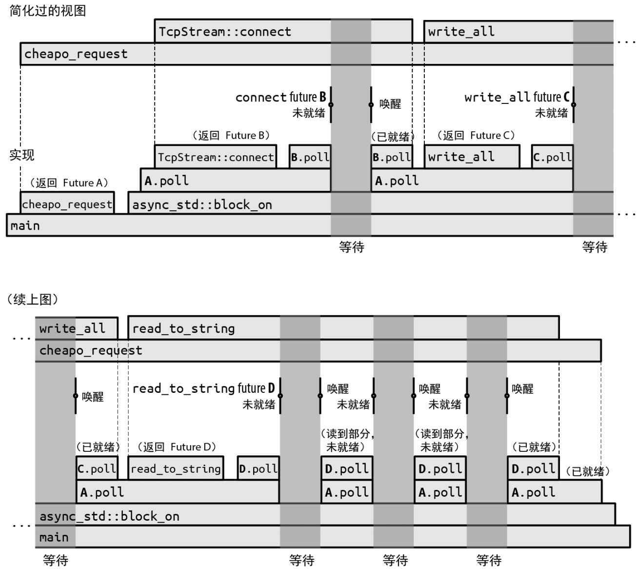 完全没必要一听到轮询就觉得效率低下。Rust 的异步架构是经过精心设计的,只要你正确实现了基本的 I/O 函数(如 read_to_string),就只会在值得尝试时才轮询 Future。每当调用 poll 时,必然有某个地方的某些代码返回了 Ready,或者至少朝着那个目标前进了一步。20.3 节会对此工作原理进行解释。