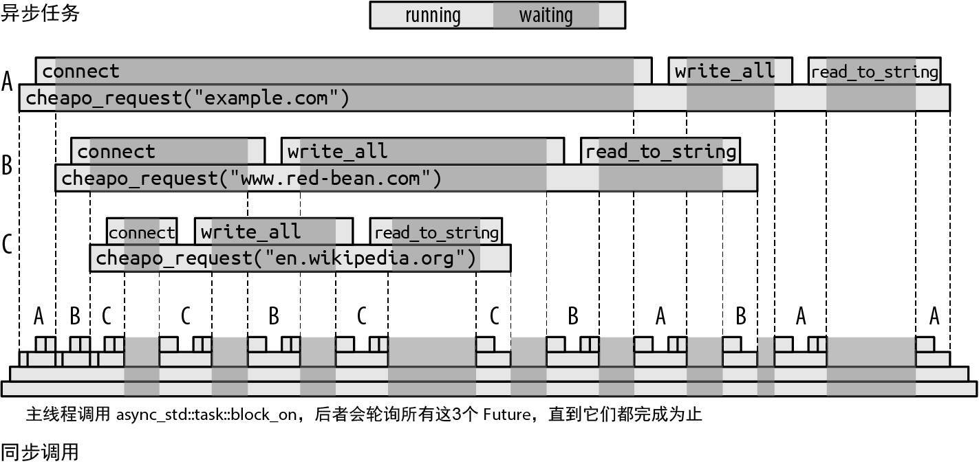 fn read_to_string(&mut self, buf: &mut String) -> std::io::Result<usize>;它直接在类型签名里表明,这个函数在完成工作或出现问题之前不会返回。因此这个函数是 同步 的:调用者在操作完成后才会继续。如果想在操作系统工作时将此线程用于其他任务,就需要一个新的 I/O 库来提供这个函数的异步版本。