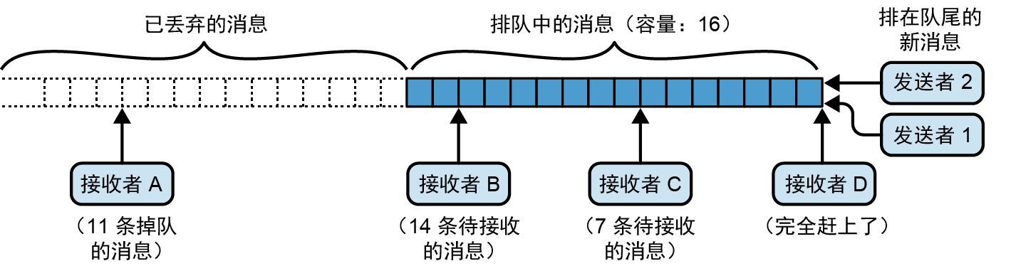 特别是,我们希望能好好处理 背压。也就是说,即使一个客户端的网络连接速度较慢或完全断开连接,也绝不能影响其他客户端按照自己的节奏交换消息。由于“龟速”客户端不应该让服务器花费无限的内存来保存其不断增长的积压消息,因此我们的服务器应该丢弃那些发给掉队客户端的消息,但也有义务提醒他们其信息流不完整。(一个真正的聊天服务器会将消息记录到磁盘并允许客户端检索他们错过的消息,但这里不考虑那样做。)
